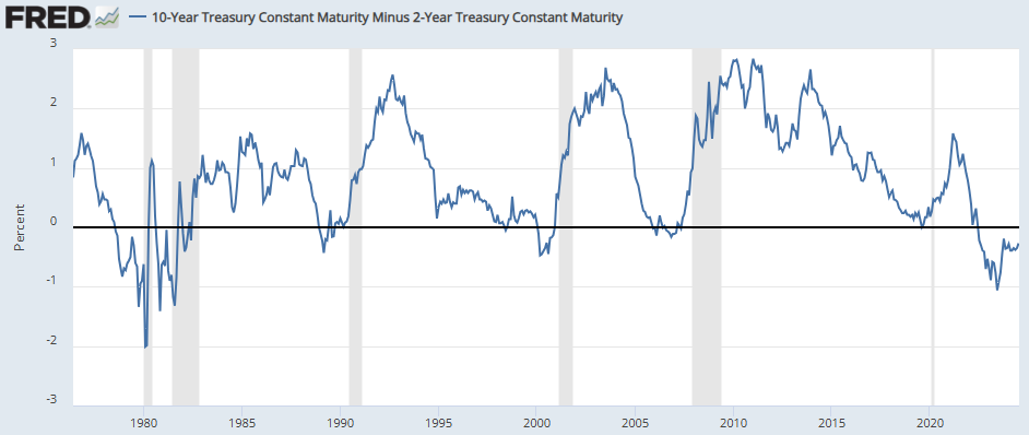 The US 2/10-year yield curve has been inverted since mid-2022. Typically, inversion has signalled recession, but it clearly hasn’t this time around (to the chagrin of many).