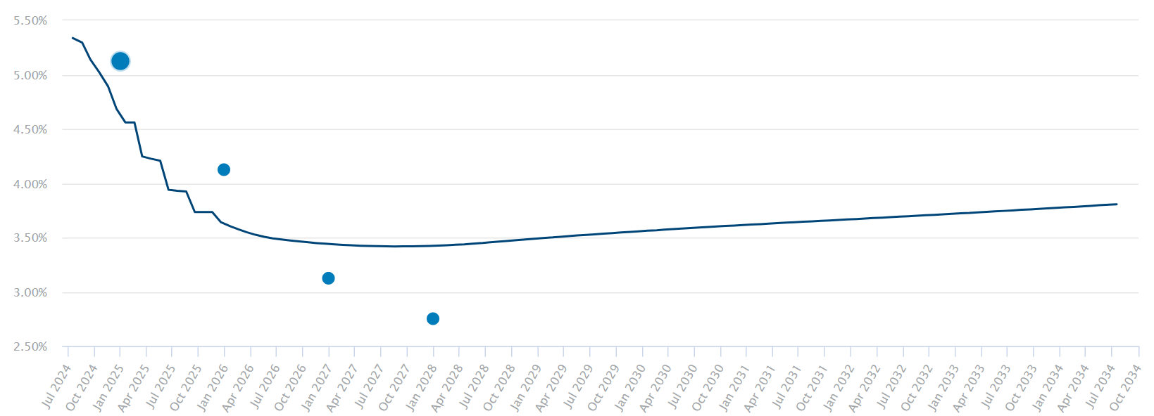 This curve places Fed policy rates at about 3.75% by the end of 2025. This is below the Fed’s own forecasts, as the dots above show.
