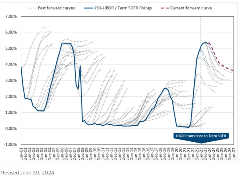 Let’s put this in terms of current market pricing. The chart below illustrates the 1-month SOFR forward curve and the Fed median dot plot.
