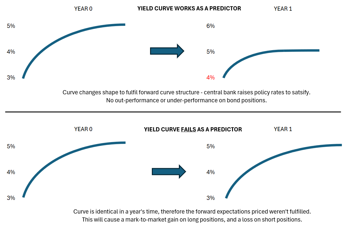 Going back to our simple example of a 3%, 4% and 5% yield curve. In this case, if the yield curve WAS a predictor of where rates would be at 1 and 2 years into the future then in 1 years’ time the overnight rate would be 4% and the 1-year rate would be 5%.