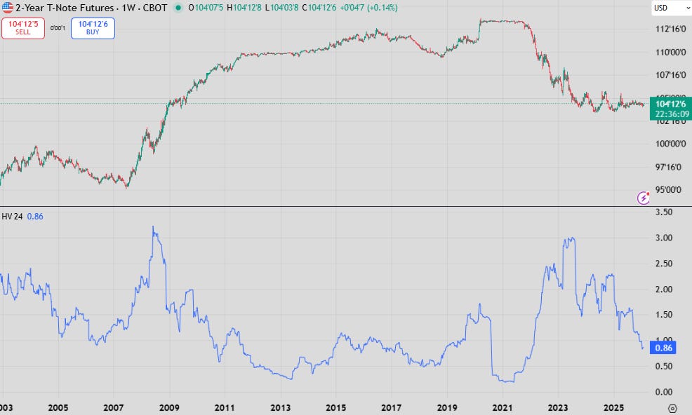 Volatility on the 2-year T-note contract is now in the mid-range of what persisted during ZIRP, while 2-year rates are at 3.5% and all the aforementioned worries persist in the market.