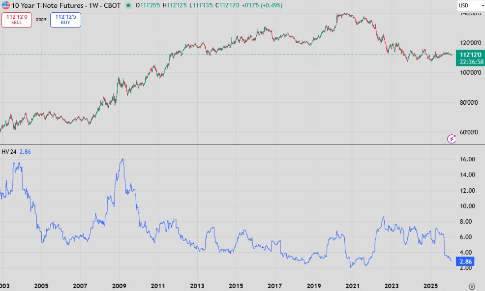 In 10s the story is even worse. Realised volatility is as lower than during ZIRP and as low as just before the pandemic and during the “eye of the storm” moment before the Fed realised it had an inflation problem on its hands. This also includes the “Liberation Day” drawdown in equities!