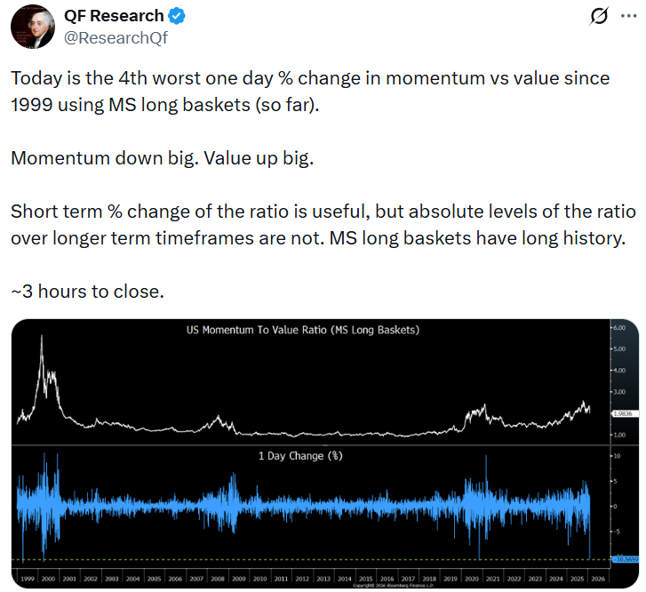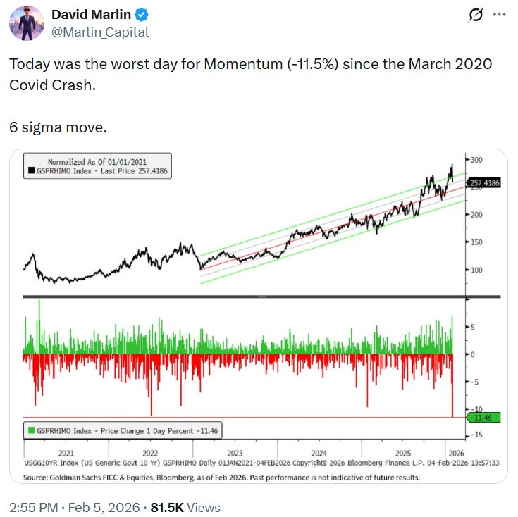 There is a narrative attached to this, as there always is. Once again worry has set in about the volume of capex attached to infrastructure and (more importantly) the morphing of cash-flow generation to consumption. This has an obvious flow on effect on semiconductor companies which have been the strong momentum trade. Amazon reported an expected $200bn capex bill versus expectations of $141bn! Truly a turning point when it comes to the view of the future.