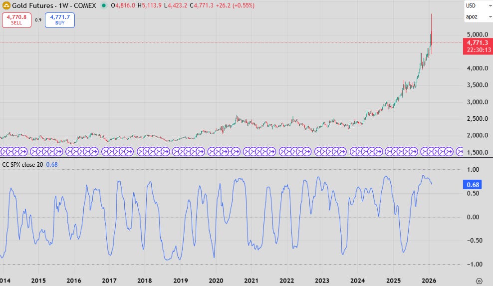 There’s little solace in gold at the moment, with correlations to equity being as positive as they ever are.