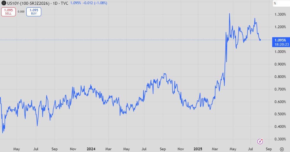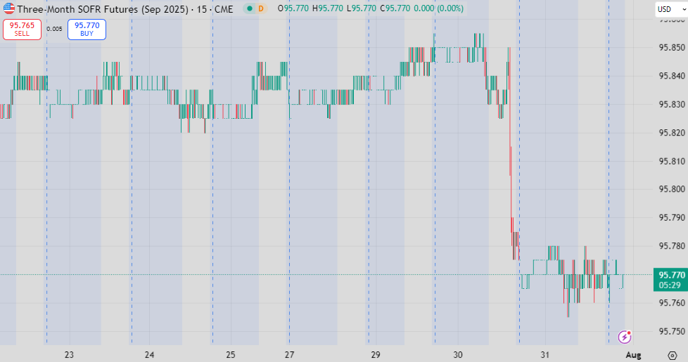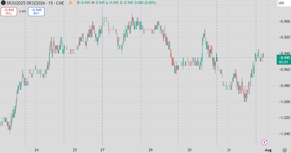 The September 2025 SOFR future backed out 10bp worth of cuts, driving the chance of a cut from 60% to roughly 40%, with some follow through after a hot PCE inflation report yesterday.