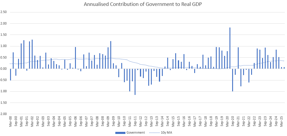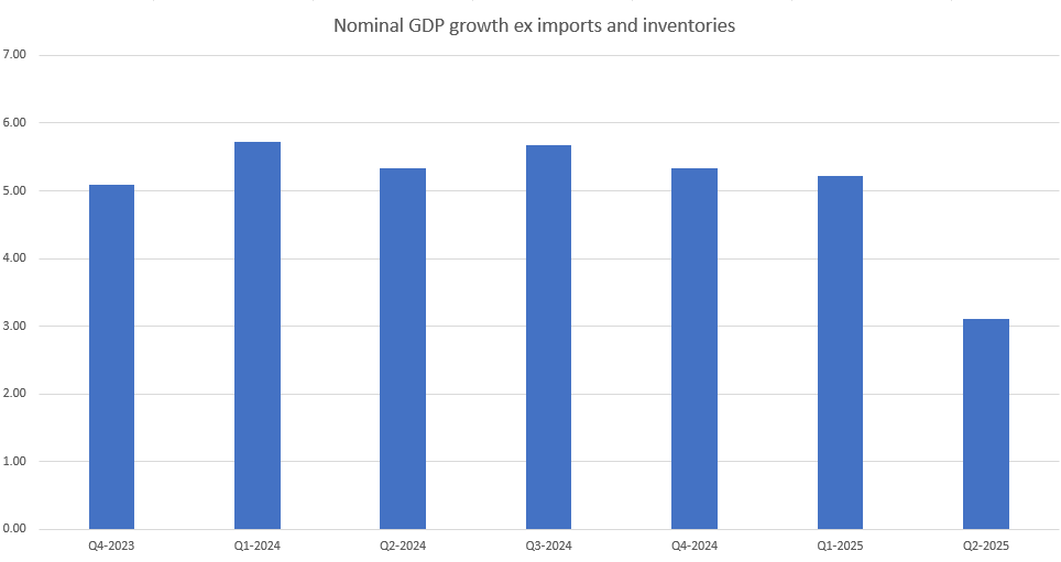 When we remove the effect of imports and inventories, it was in fact Q2 where the weakness is evident. This is the most important measure from my point of view, since my key focus has been the effect of larger budget deficits and a recovery in private sector lending should keep this measure of nominal GDP growth above 5% as it has been.