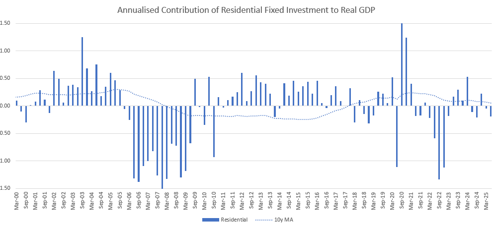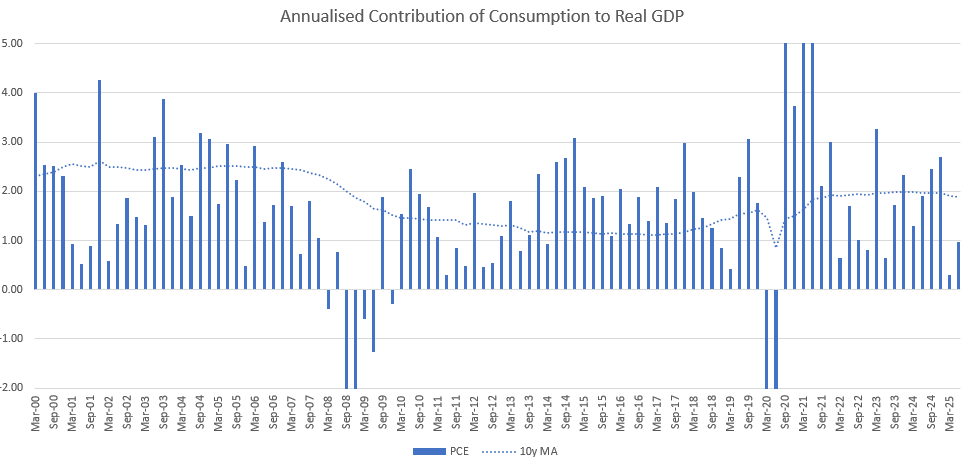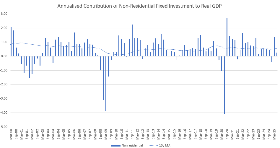 Q1’s lower consumption was offset by a large contribution from non-residential investment. Q2 saw this moderate but still remain positive.