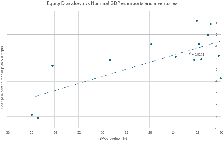 The higher the volatility in equity markets, the higher the drop in nominal GDP against the previous 2 quarters.
