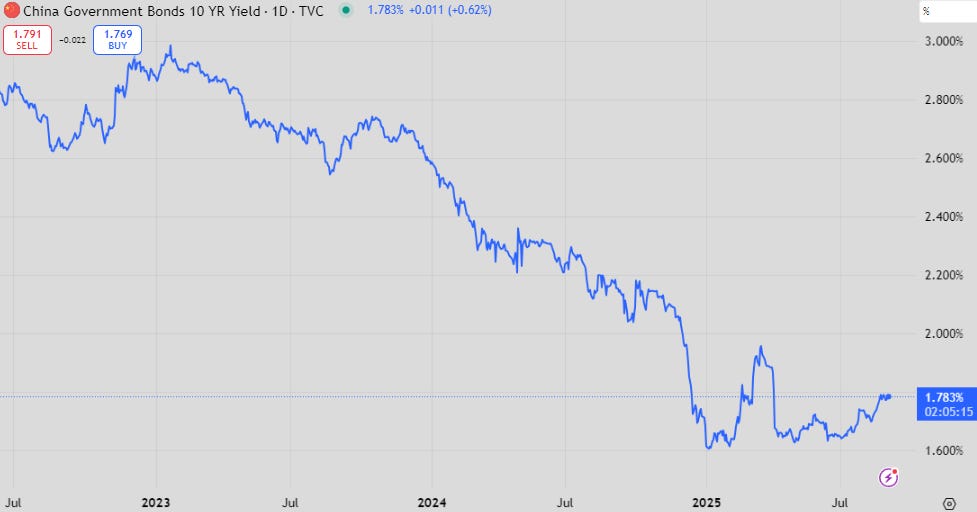 The Chinese rally against involution has caused ever falling 10y CGB rates to pick up more recently…