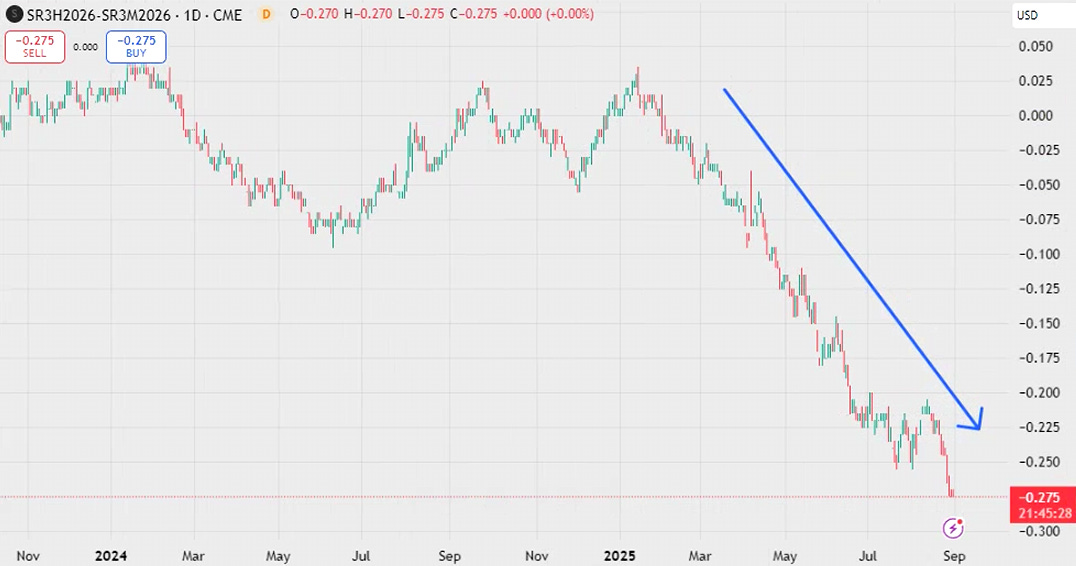 The “Powell spread” continues to fall, with a whole rate cut priced over the period Powell’s term finishes.