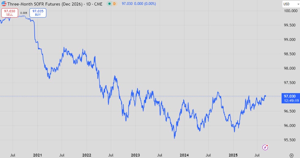 Adding to this, the nadir of the forward curve is at the lowest yield we’ve seen since the hiking cycle ended. This again is very tempting to short. While it is worth considering I don’t think it’s a great idea - there’s not a lot of gain in it and the risks are tilted against you, so maybe not as interesting as it first seems.