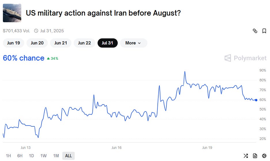 Currently July (expiring today) and August contracts are trading with the probability of US involvement.