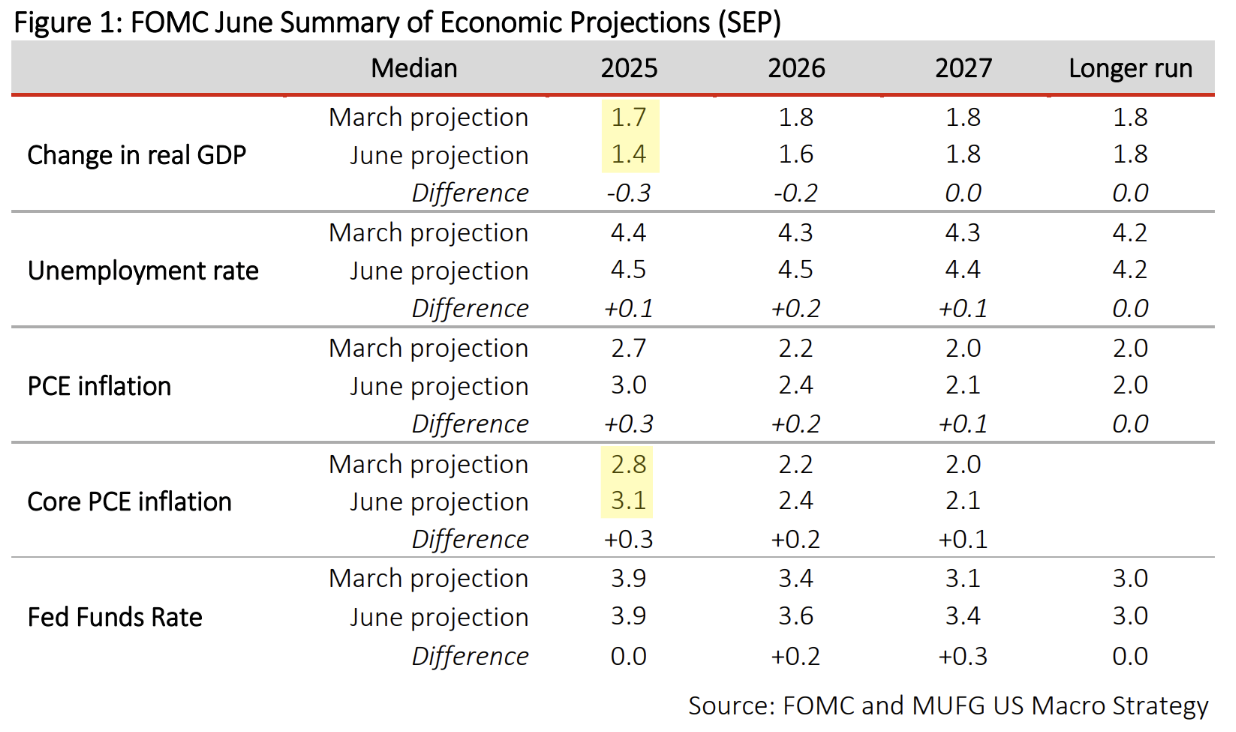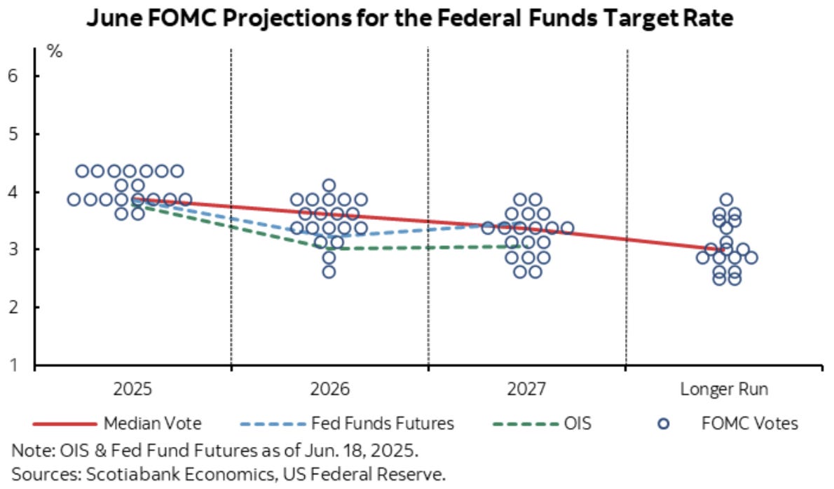 The inflation forecasts are more reasonable given the uncertainty of the sensitivity of tariff to CPI pass-through. Given the weakness of last month’s core CPI print (covered in last week’s ‘Charts & Notes’) and the slow speed of already established tariffs passing through, 3.1% (the mid of the range of forecasts with the low being 2.9%) seems high. Powell said that without tariffs, inflation would be coming down.