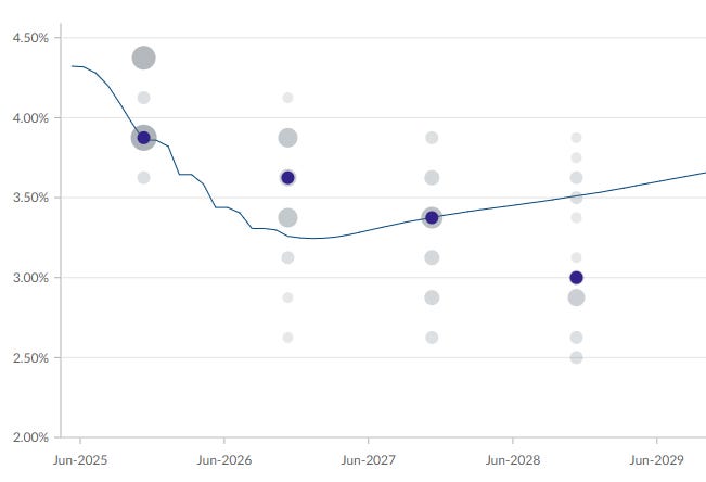 From this point of view, the Fed will be praying that inflation stays contained so that they can deliver on their sticky “dots”, because if they don’t then market pricing for 2026 will back out its premium quick smart.