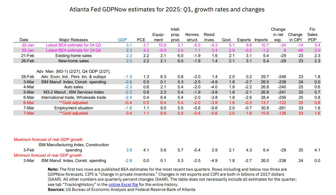 First up is an article addressing the huge contraction in GDP predicted by the Atlanta Fed GDPnow model. Turns out this was due to gold imports incorrectly affecting the forecast. The current gold adjusted model sits at +0.4% after adjusting for 2% of gold imports. This includes -1.89% from net imports from dragged forward demand from tariffs.