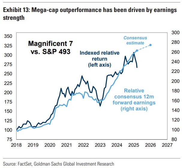GS has started to revise down earnings forecasts for the S&P500, pricing in 7% now versus consensus of 10%. The sensitivity of Mag7 to the same forecasts is seen clearly in the chart above. They last upgraded their forecasts to 11% growth in June 2024.