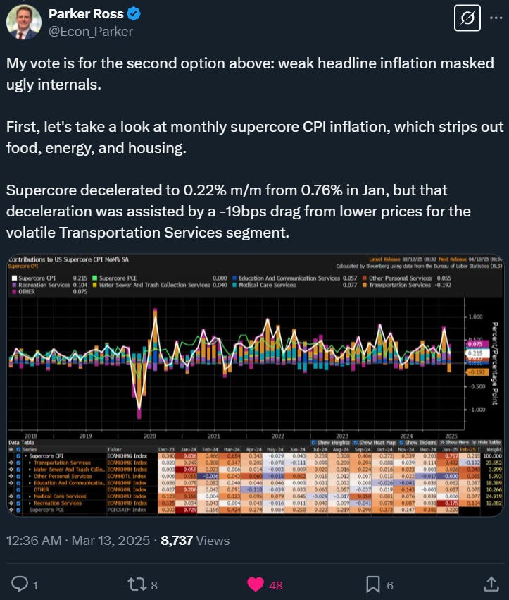 Inflation printed low in what seemed like a very soft print. Bonds rallied but quickly reversed as it hid a nasty composition. Well worth going through Parker’s thread for a breakdown.