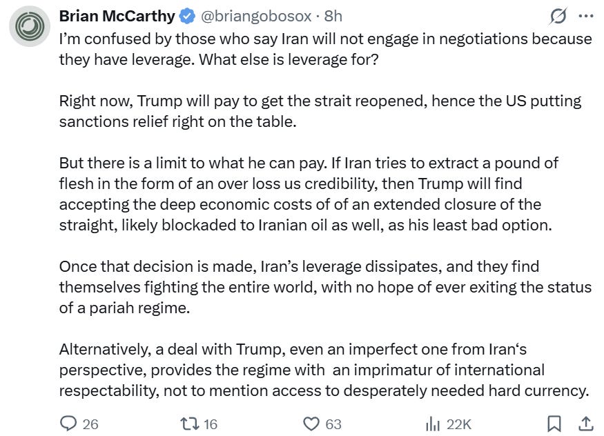 Agreeing to ceasefire also means that Iran can’t force shipping to pay tolls since they can’t fire on commercial vessels (which would obviously break the ceasefire) and would result in an open Strait. Such a deeply binary outcome for Iran as well.