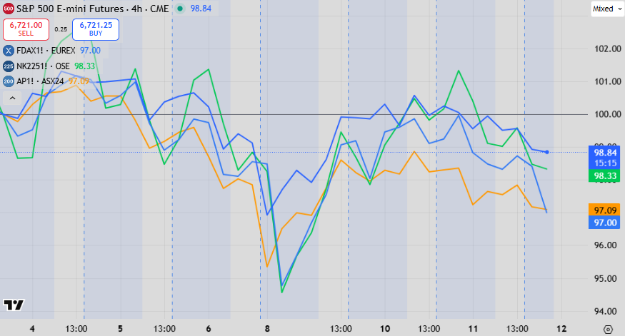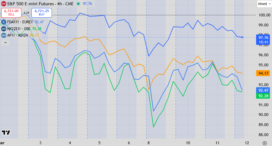 After that point, the divergence is minimal at less than 2%. The US outperformed during Monday’s big drawdown but also recovered less. The short-term trend is fairly clear here.