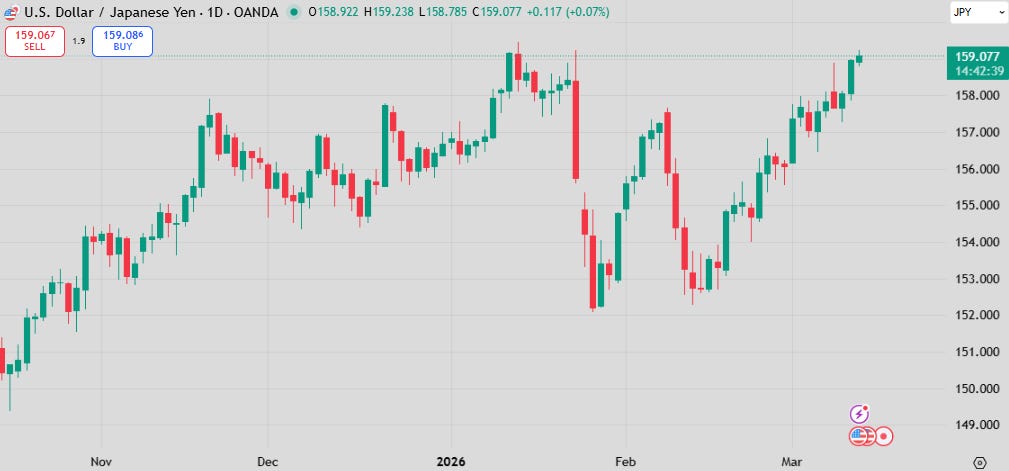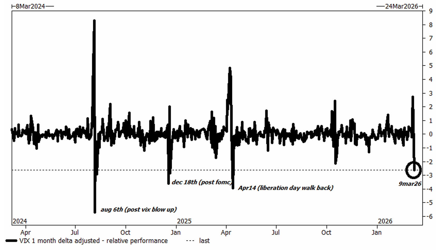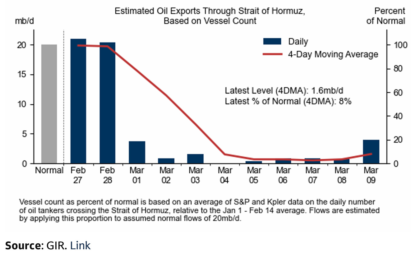 Many are surprised by this sort of slow burn sell-off in equity indexes. To me it makes perfect sense. The extreme cases (US wins and gains control of the Strait or nobody gets urea/LNG/helium and dies) is so vast that we can only price in the middle. Individual headlines (another tanker gets attacked/a desalination plant explodes) are negative, but these events singularly aren’t important in themselves, so no single event can cause a large drawdown. Many more tankers will get hit. Eventually the market will become immune to it (as sad as that sounds).