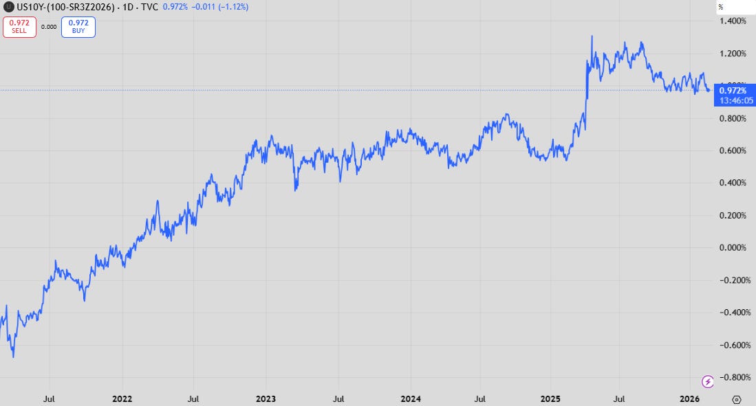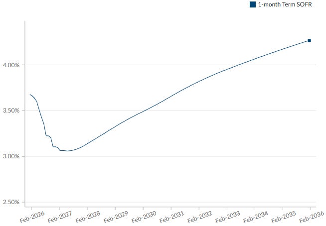 At the moment, the terminal rate implied by 1-month SOFR futures sits at just over 3% somewhere in the middle of 2027 but pay attention to the shape of this curve.