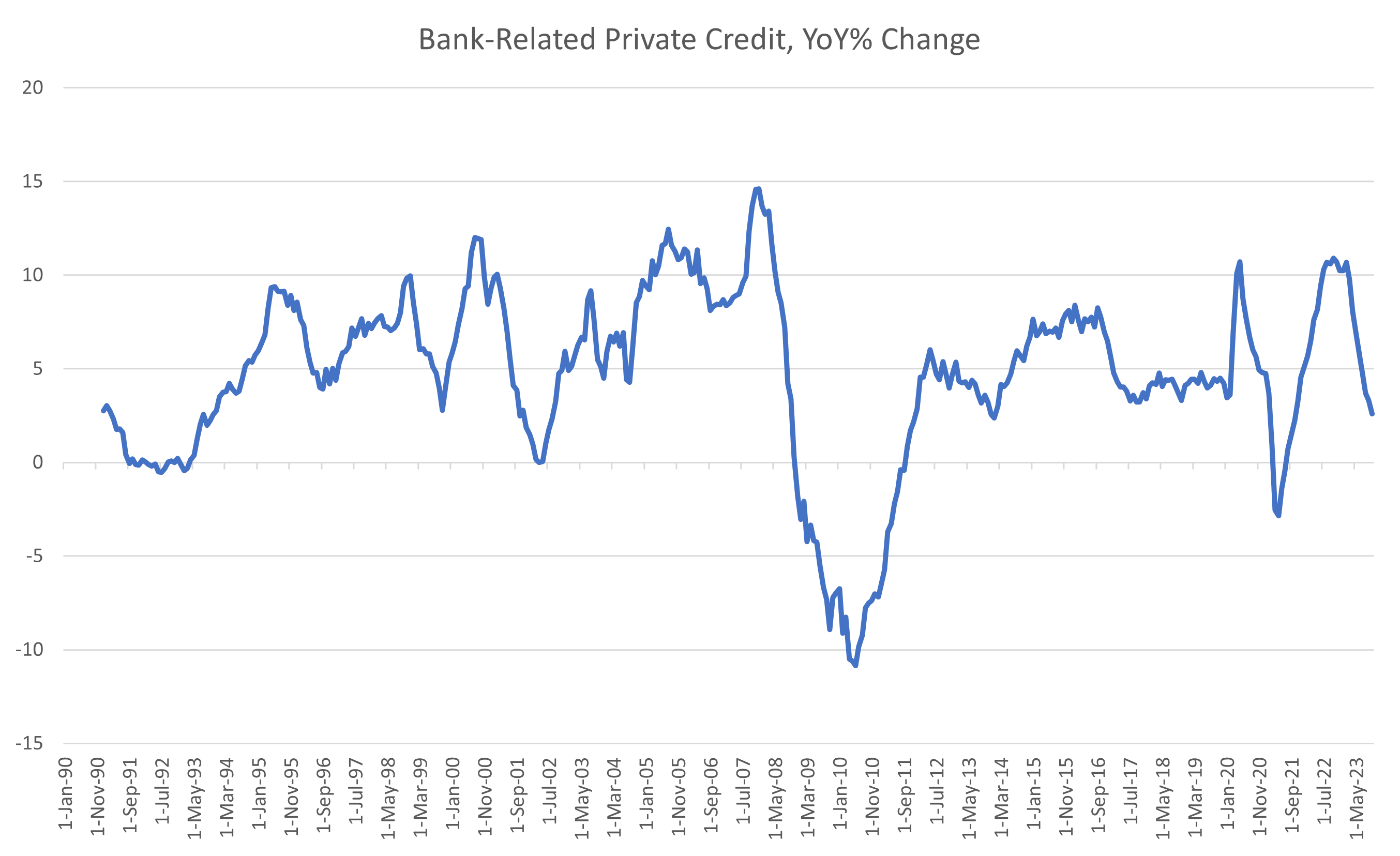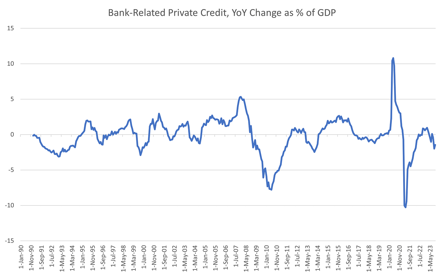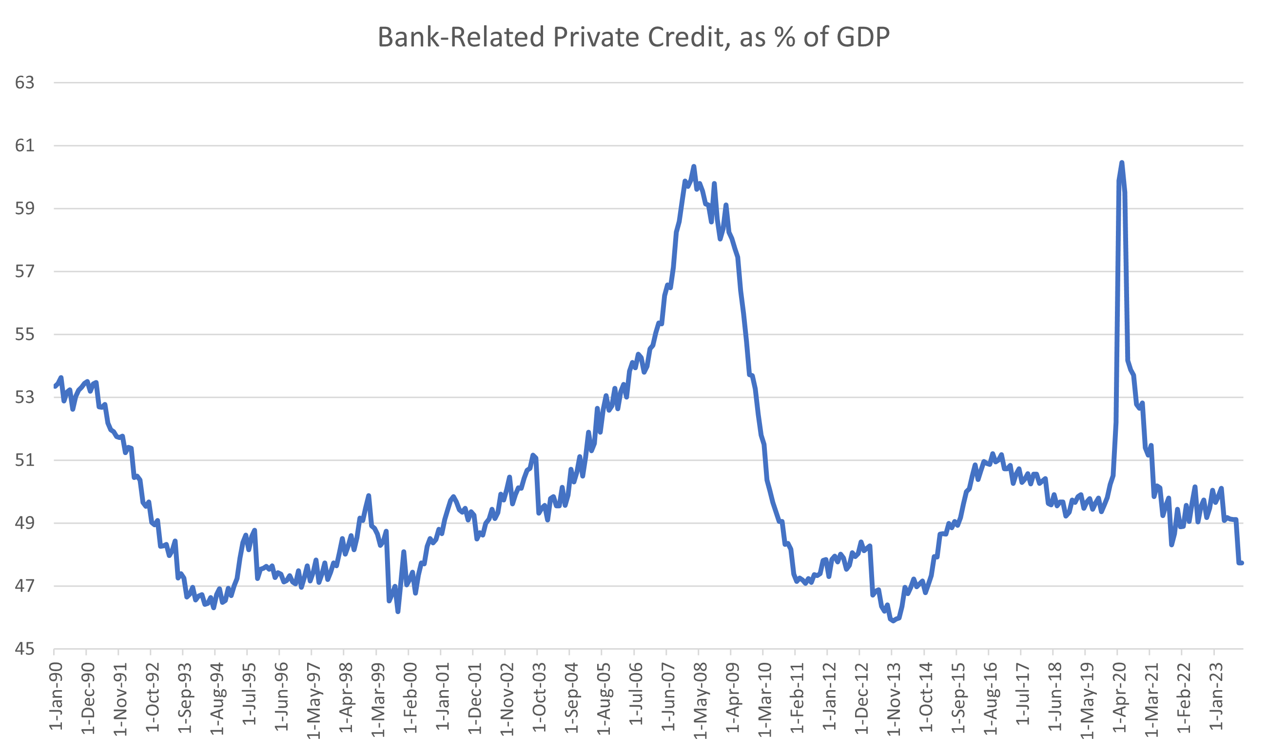 My dataset of all bank-related private credit2 shows containment in a tight range since 1990, bouncing in between 47% and 53% of GDP, with the notable exception of in the lead-up to the GFC.