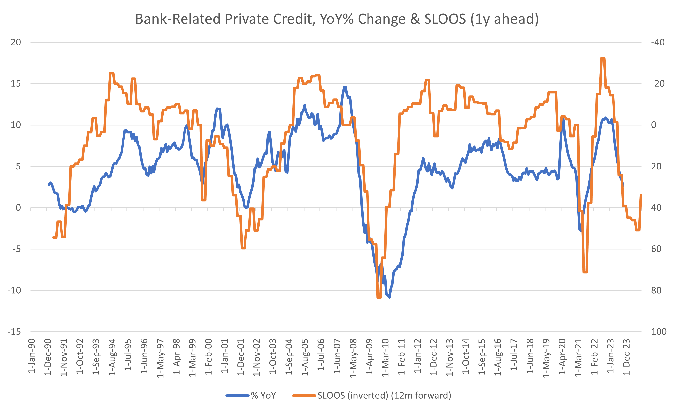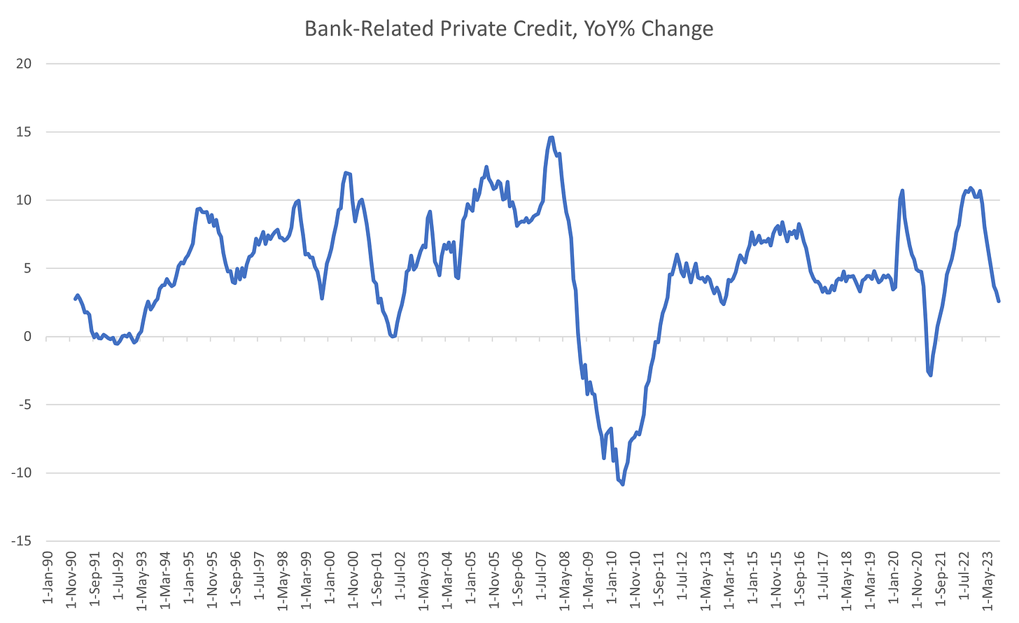 This has resulted in the year-on-year change in bank-related private credit to slow to recession risk levels. For those that use the year-on-year M2 chart as a recession signal, this version works far better than M2 as it captures the relevant “asset side” of all deposit-like liabilities3. This measure is still indicating growth over the last year, but shorter-term measures are contracting, a result which is rare, and concerning.