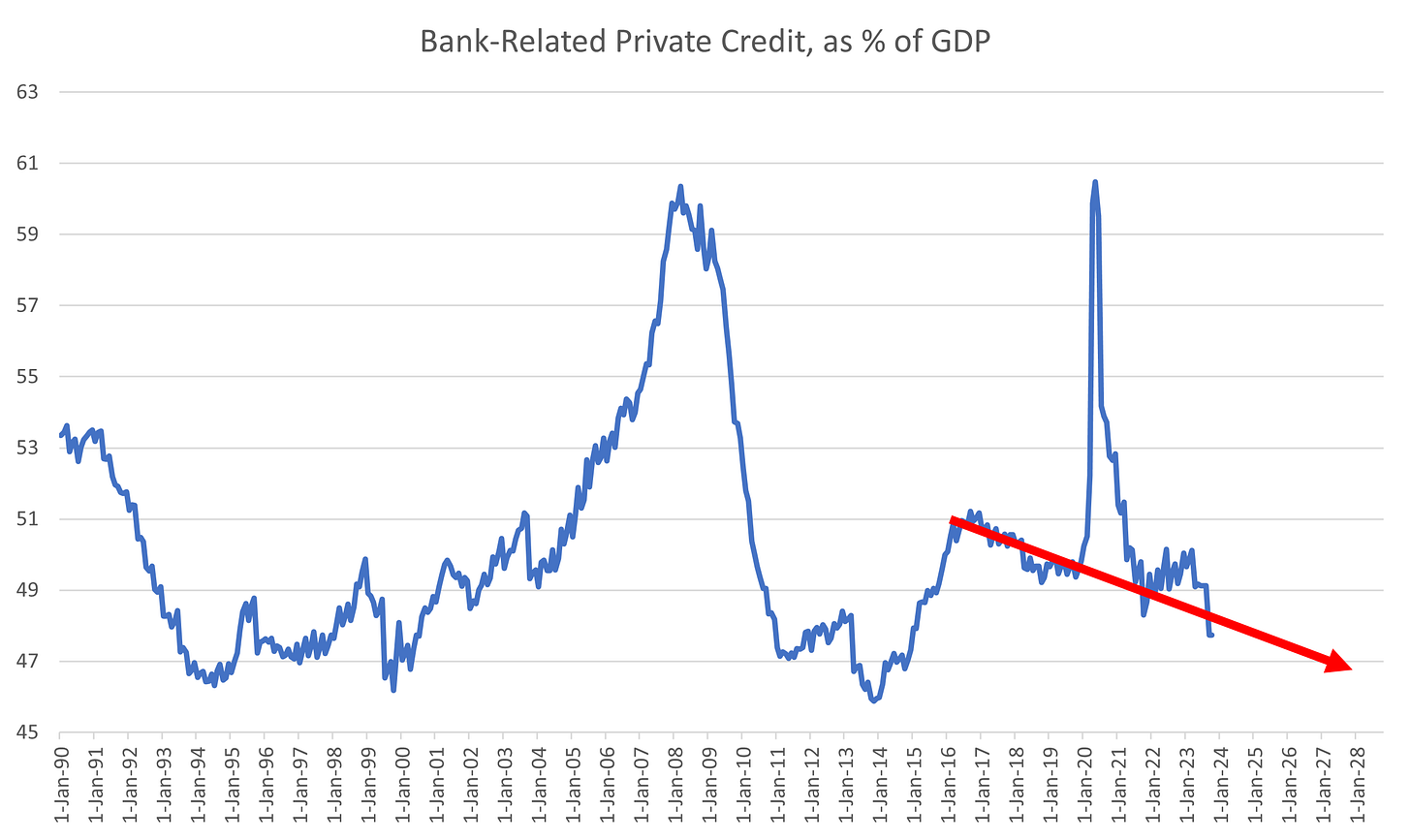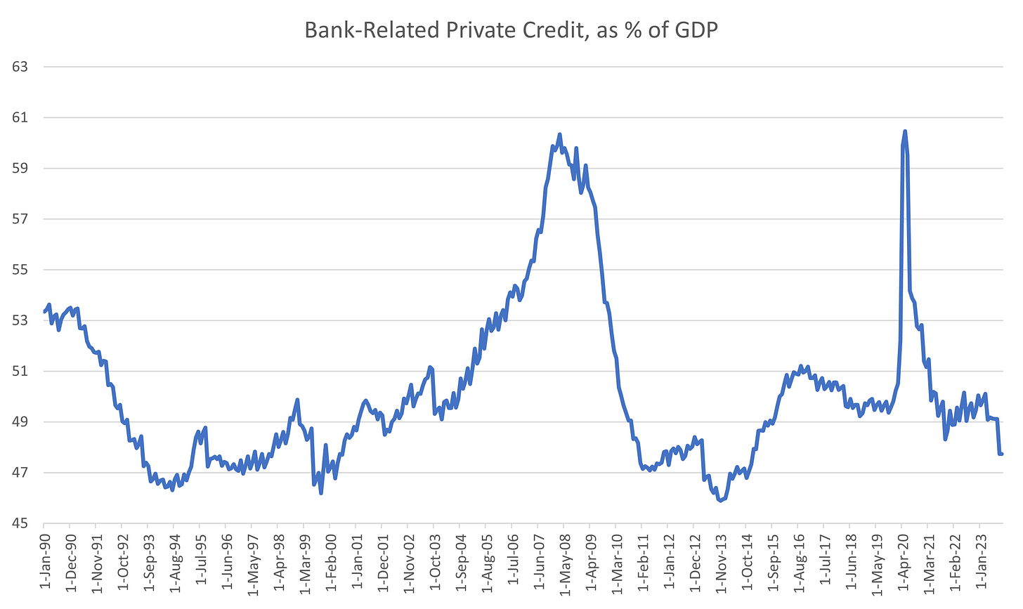 We are heading towards the bottom of that range now, with bank-related private credit stagnating in nominal USD terms and nominal growth racing ahead the proportion compared with GDP has fallen.