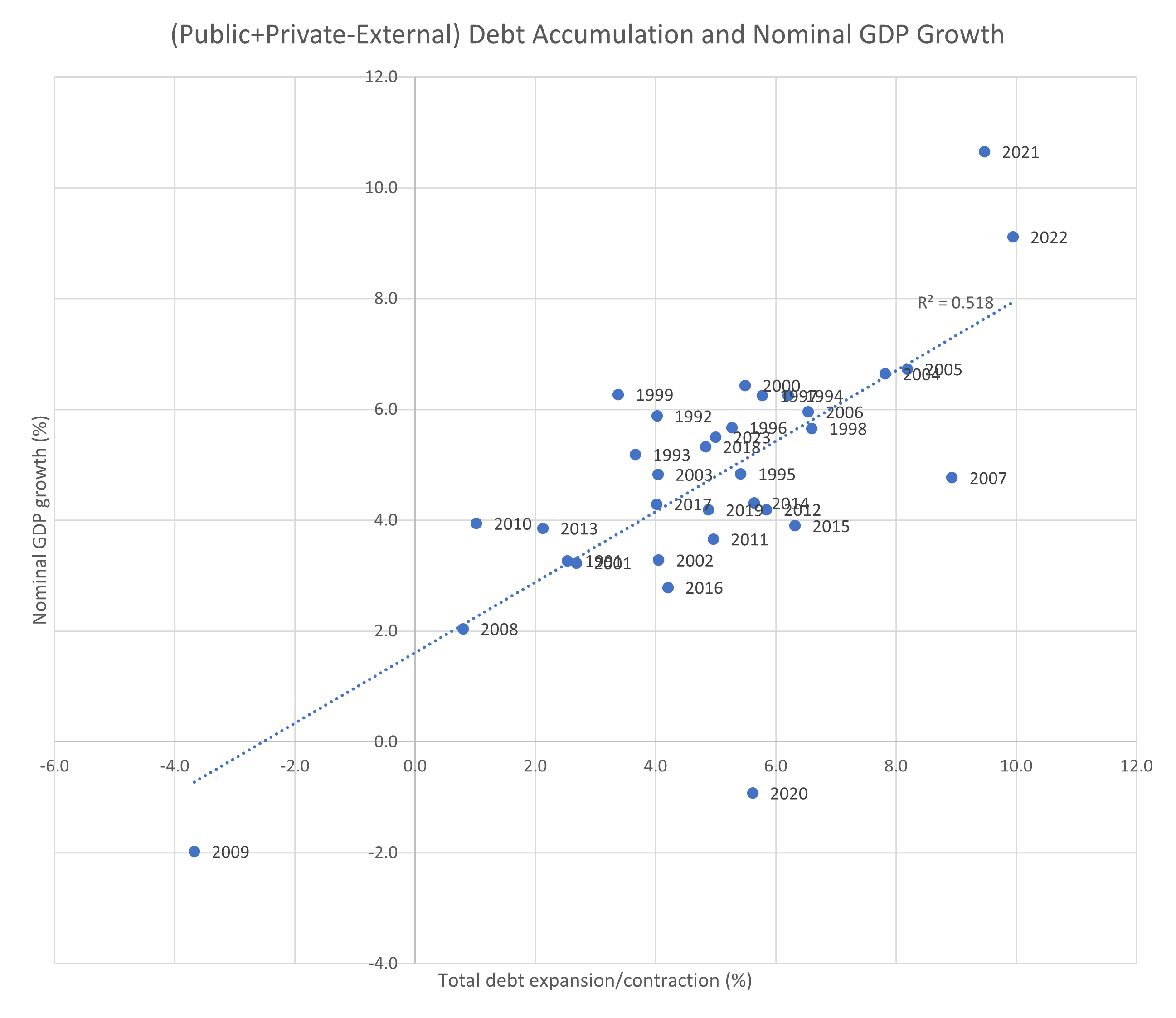 The model does a remarkable job of predicted nominal GDP growth in most years, with large errors only occurring in 1999, 2007 and 2020. Errors seem to a strong signal of impending crisis; however, they vary between over-predicting and under-predicting growth.