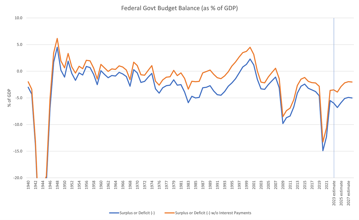 Unless there is some regime change inherent in a higher level of interest rates that allows discretionary spend to reduce, I consider the OMBs forecasts to be unlikely, meaning that the deficit will likely continue to expand resulting in a “business-as-usual” deficit of 8% of GDP rather than the OMB’s forecast in the chart above of 5% of GDP.