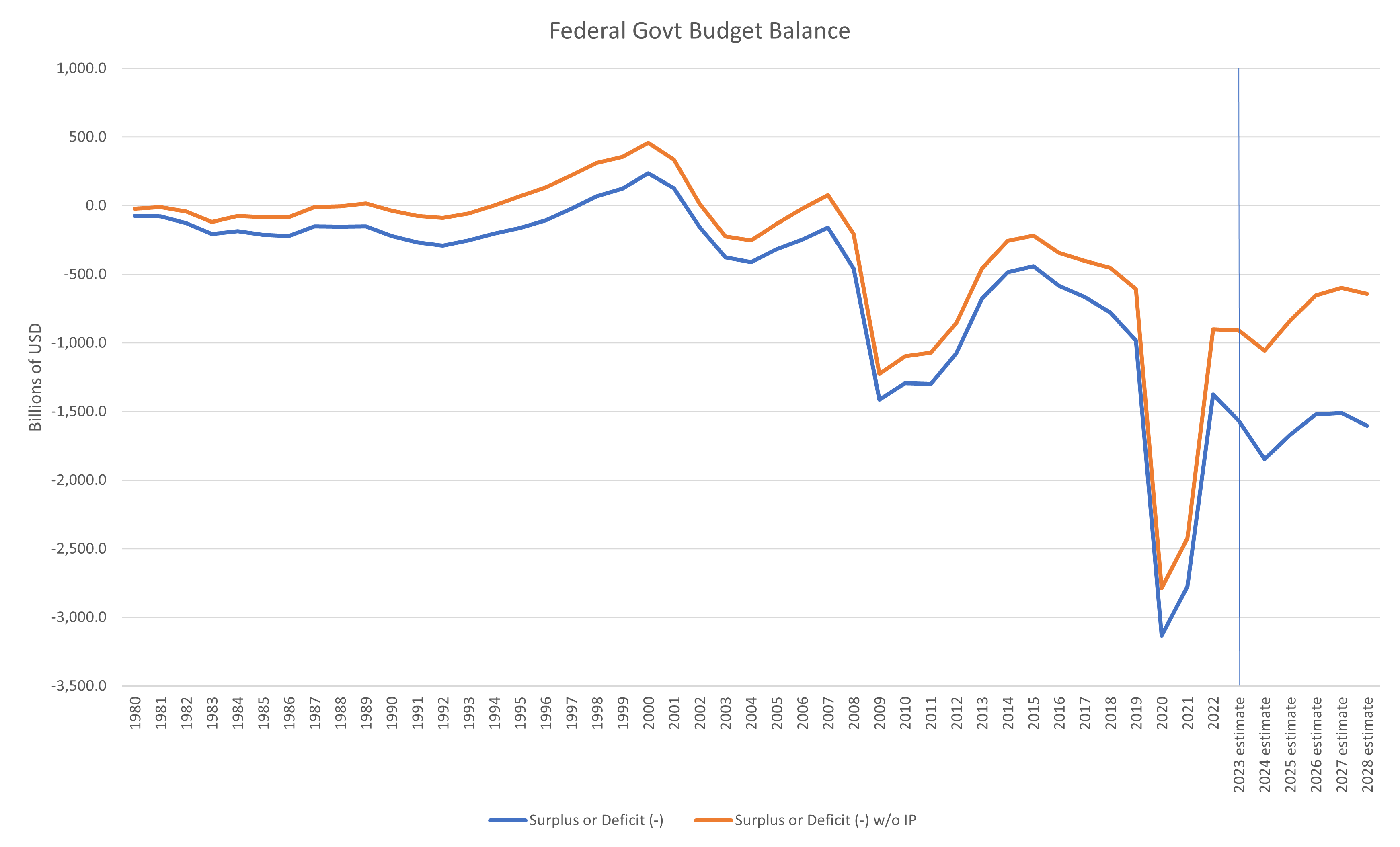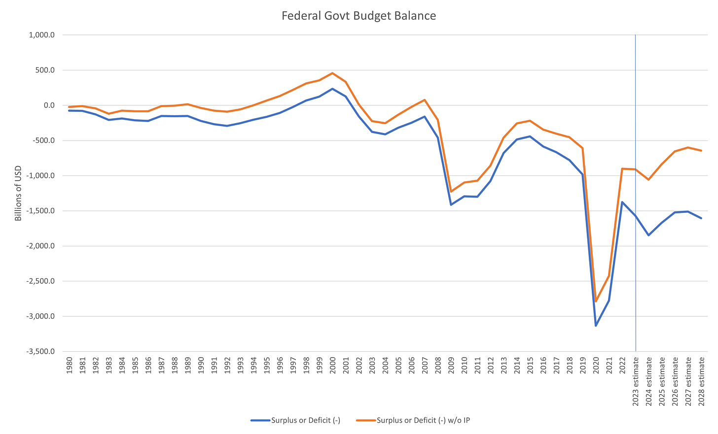 Despite this, the OMB estimates that the deficit will worsen only slightly from the 2023 estimate, despite another $400bn of interest costs yet to hit the budget. The widening gap between the deficit including and excluding interest payments can be seen in the chart below.