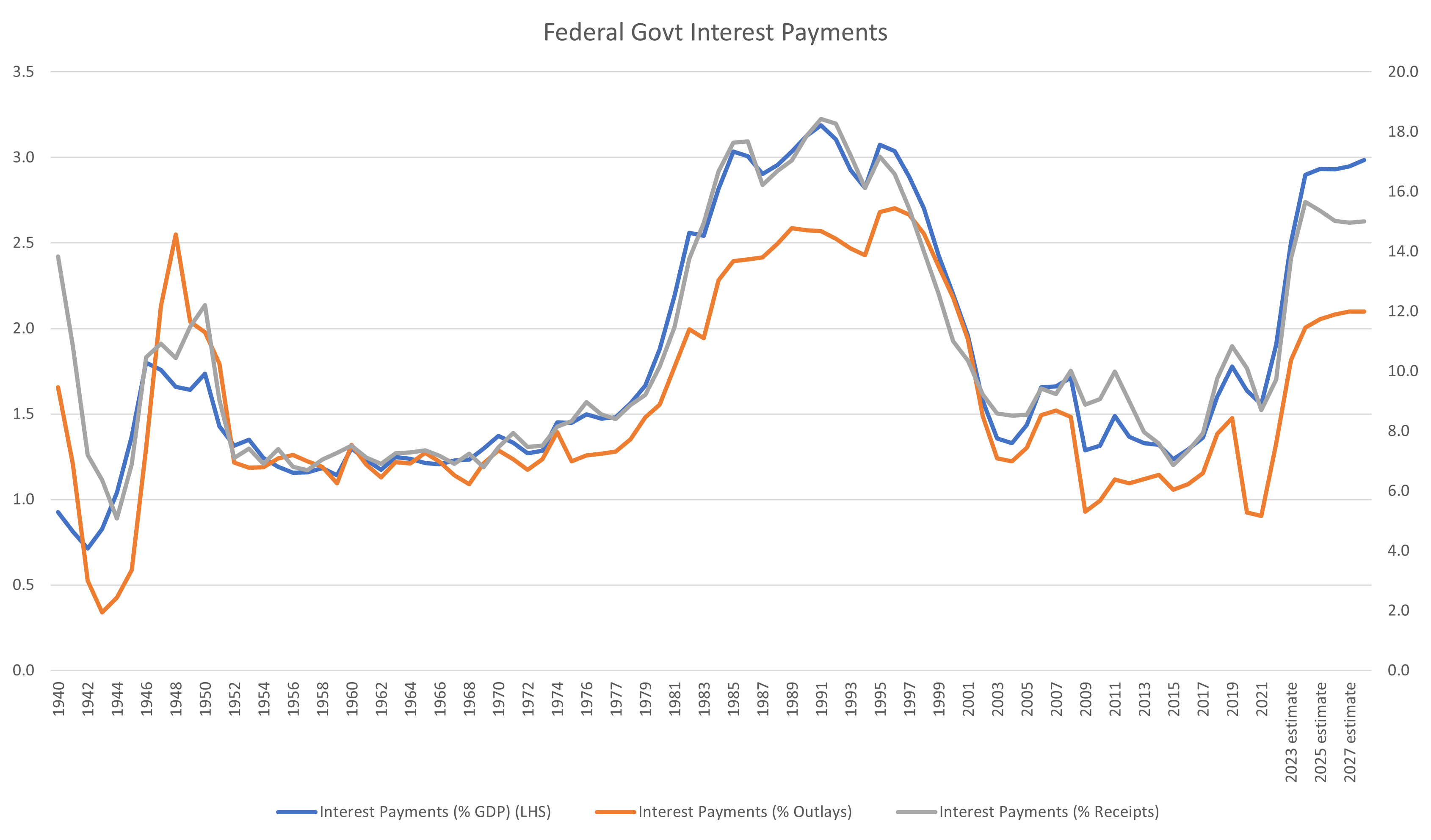 When compared to history, the current quantum of interest payments has reached the peak as a percentage of GDP that occurred during the late 70s and early 80s.